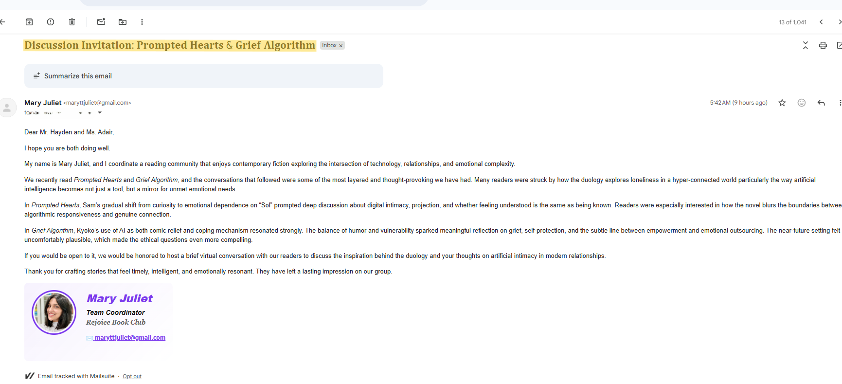 It contained glowing remarks about my latest novel Prompted Hearts & Grief Algorithm from the representative of book club called "Rejoice Book Club."