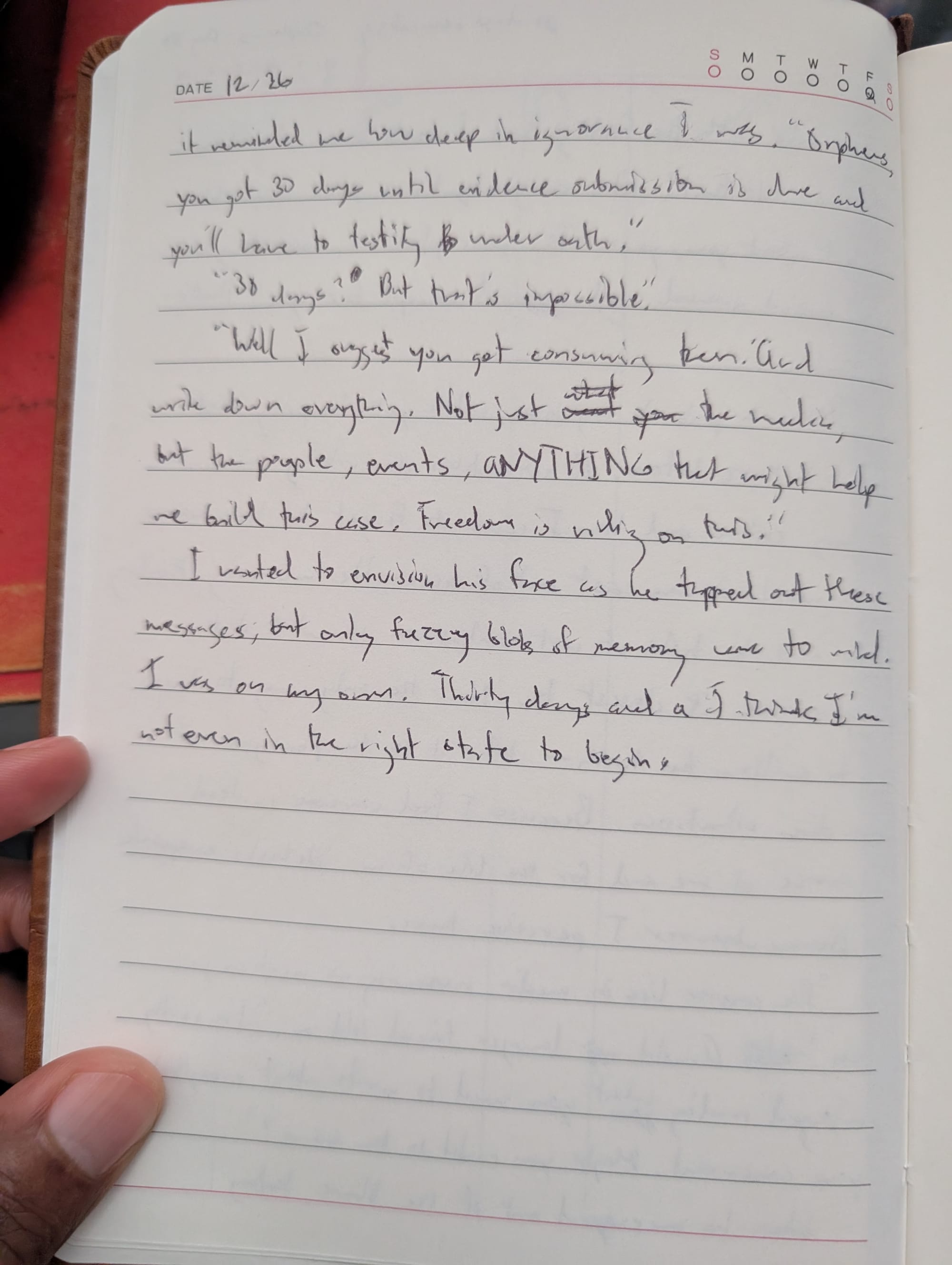 “Well I suggest you get consuming then. And write down everything. Not just what you consume, but the people, events, ANYTHING that might help me build this case. Freedom is riding on this.”