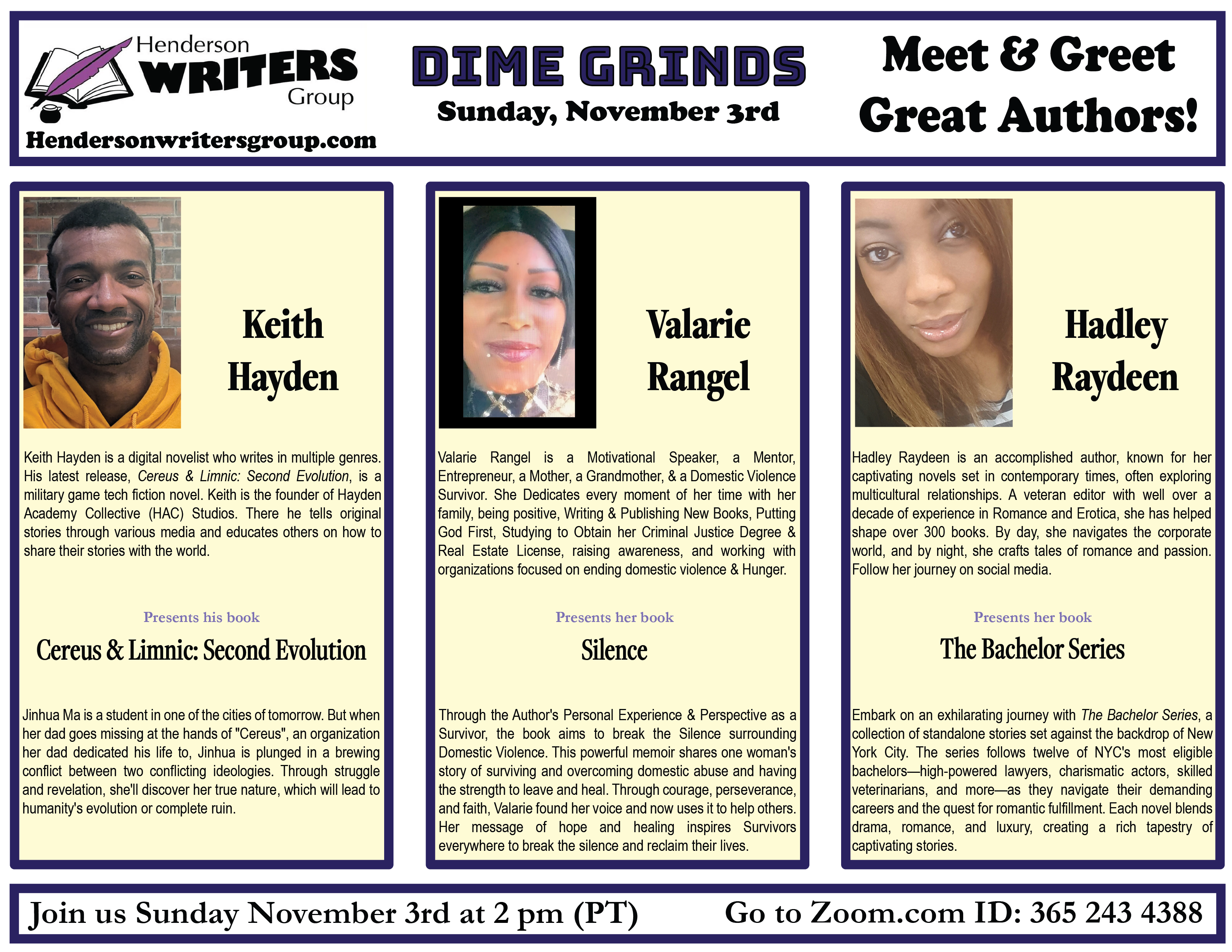 It's an author showcase where I'll talk a bit about my writing background, read some of my military game tech fiction novel Cereus & Limnic: Second Evolution, and answer your questions about anything writing related.
