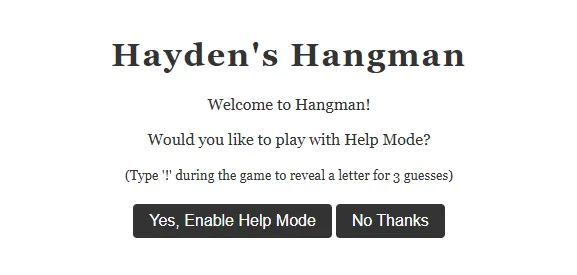 Using the structure and requirements from the problem set, I wrote the helper functions and the main game logic myself. I had to think through each step carefully: how to represent the hidden word, how to handle guessed letters, how to track remaining tries, how to decide when the game was won or lost, and how to make the whole thing run smoothly from start to finish. There was also an added help-mode feature where typing an exclamation point would reveal one of the letters, which required even more logic and coordination with the rest of the game.
