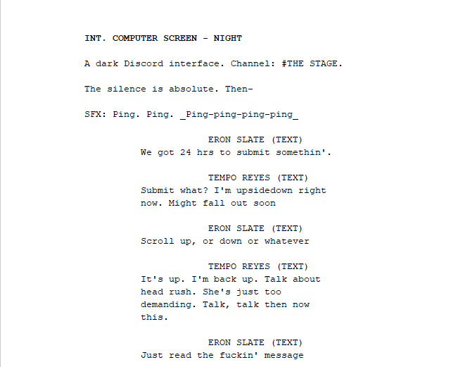 Two: it forces me to think in beats, which is something I don't always do when writing standard prose.